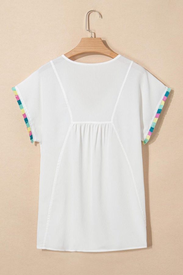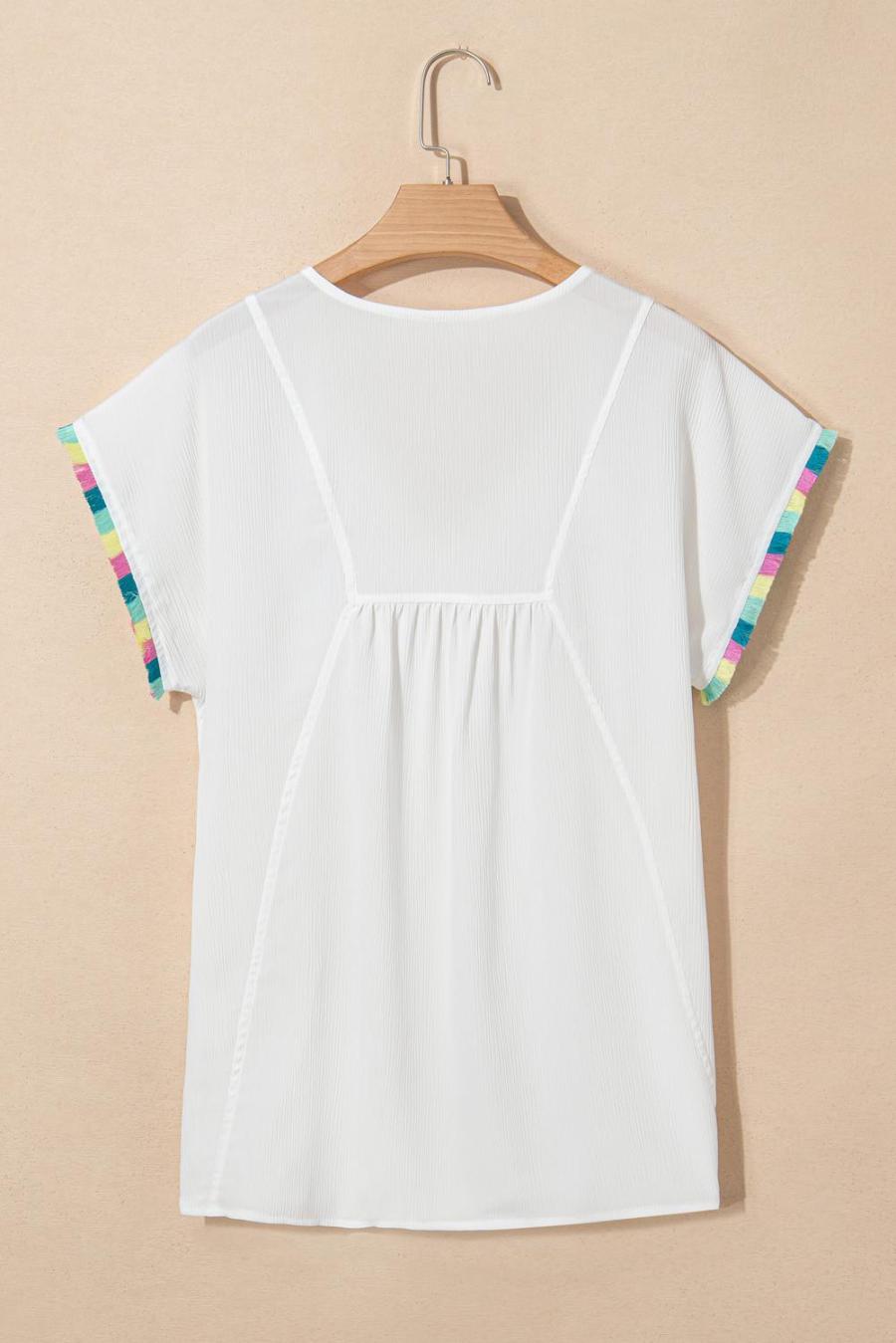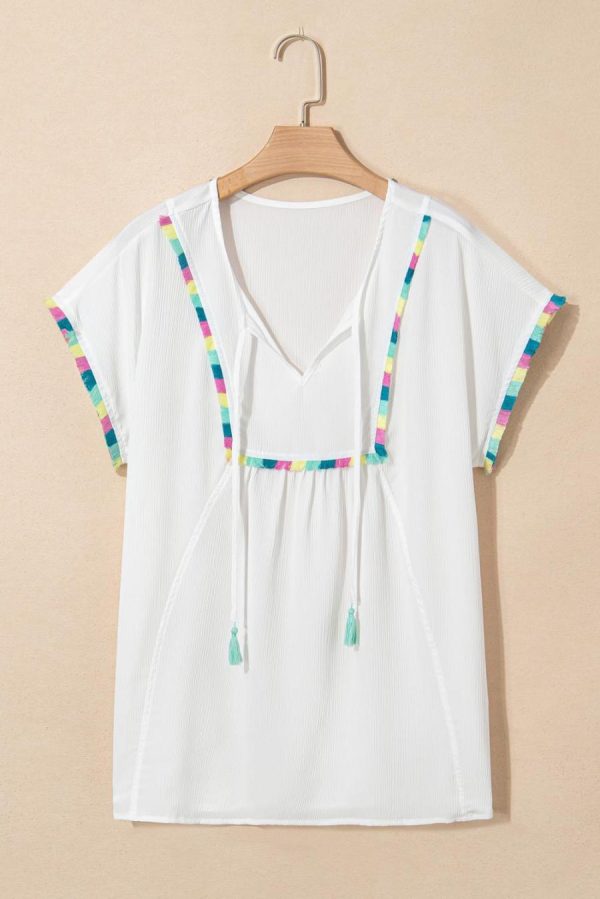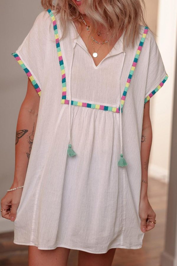 Cover-Ups | White Colorful Fringed Detail Tassel Tie Neck Short Sleeve Cover Up – Women