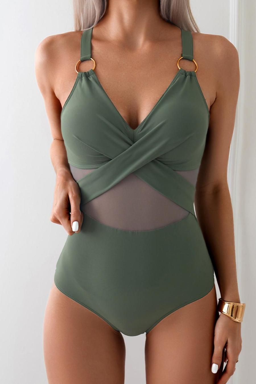 One-Piece | Green Bay Criss Cross V Neck Mesh One Piece Swimsuit – Women