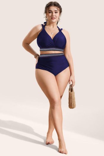 Bikini Sets | Navy Blue Embroidered Trim Wrap Tie Knot Plus Size High Waisted Bikini Set – Women